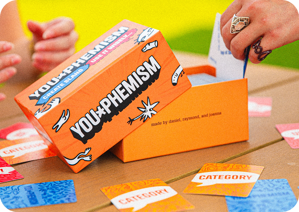 Youphemism is a card game where you come up with new slang, stories, and inside jokes for common phrases.